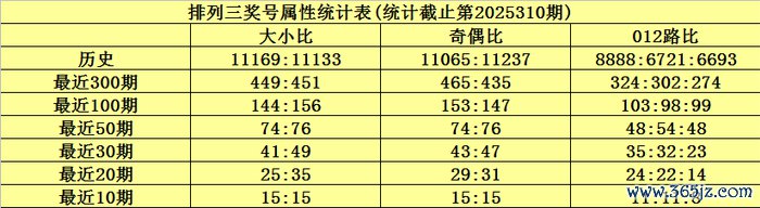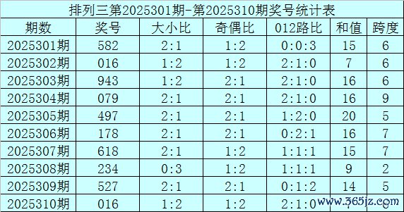 上期回来:罗列三第2025310期奖号为016,奖号012路比为2:1:0,奇偶比为1:2,大小比为1:2,和值为7,跨度为6。