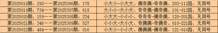 在成列三历史开奖中,第2025018期-第2025022期采集5期奖号为:292-734-159-346-484。